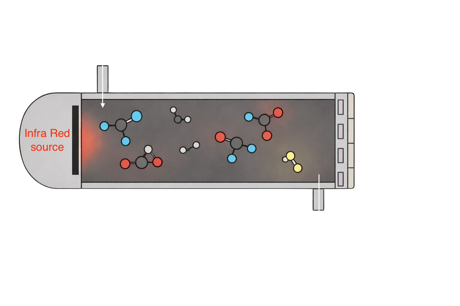 Infrared spectroscopy is a principle for organic and inorganic chemistry analysis using infrared light interacting with a molecule. Infrared spectroscopy exploits the fact that molecules absorb specific wavelengths of light that are characteristic of their structure. Selected molecules have specific resonant frequencies where the absorption of radiation with proper wavelength is significantly higher in comparison to other parts of the spectra. The level of absorption at a given wavelength can be precisely measured and recalculated to the amount of the substance of interest. By transmitting a beam of IR radiation through the air, or through any particular gas volume, and recording how much is transmitted at selected spectral lines, one may decide which gases are present and how much of each.